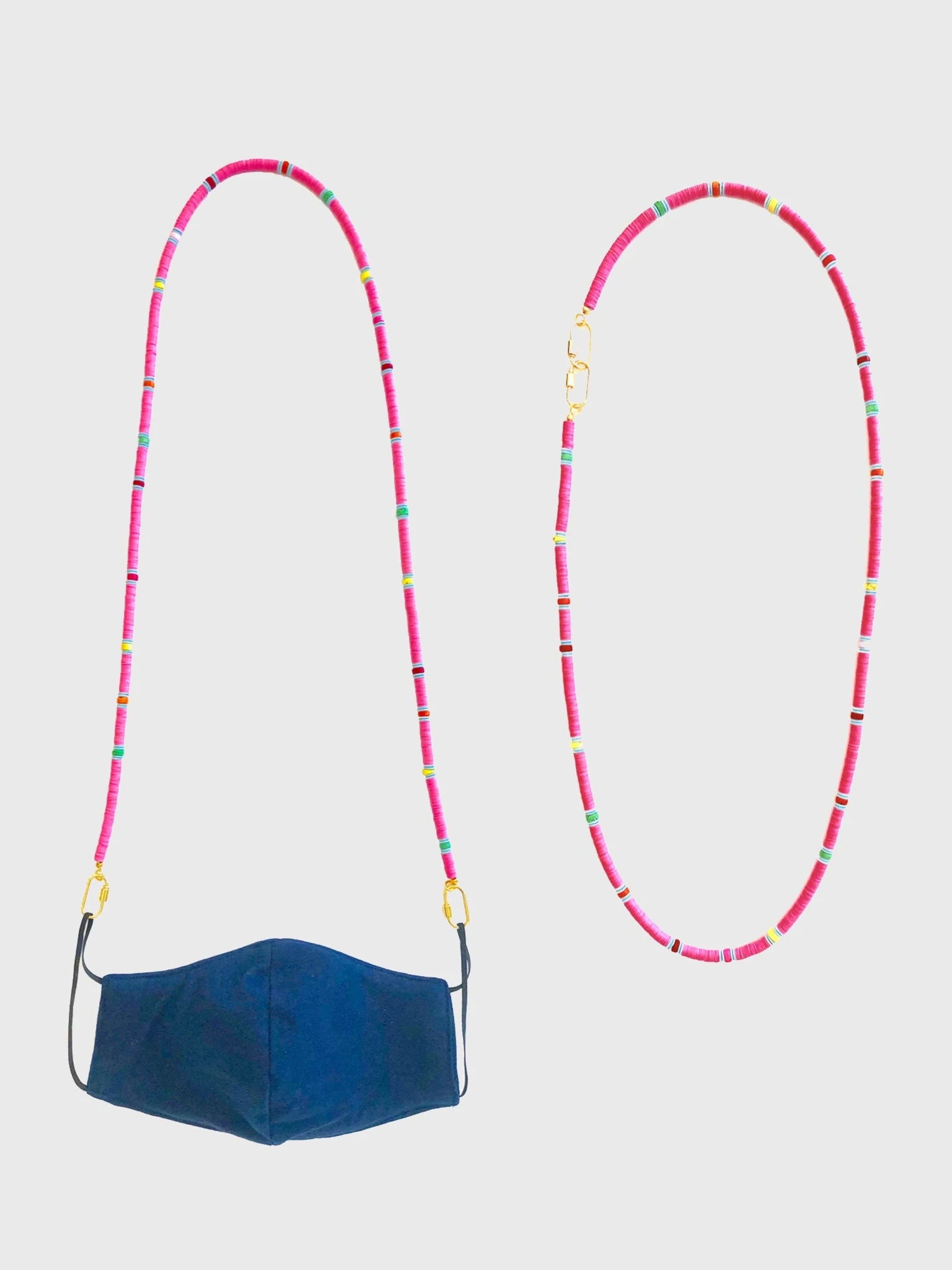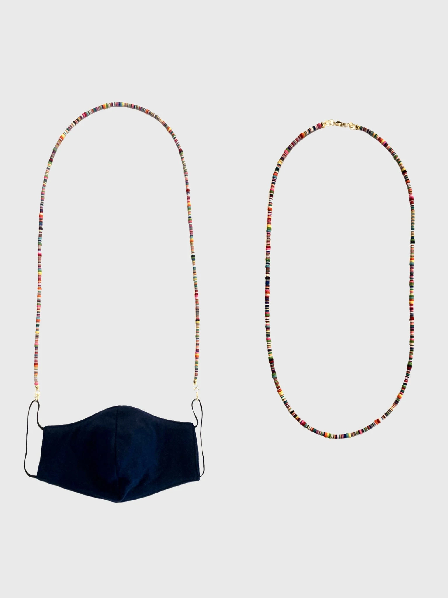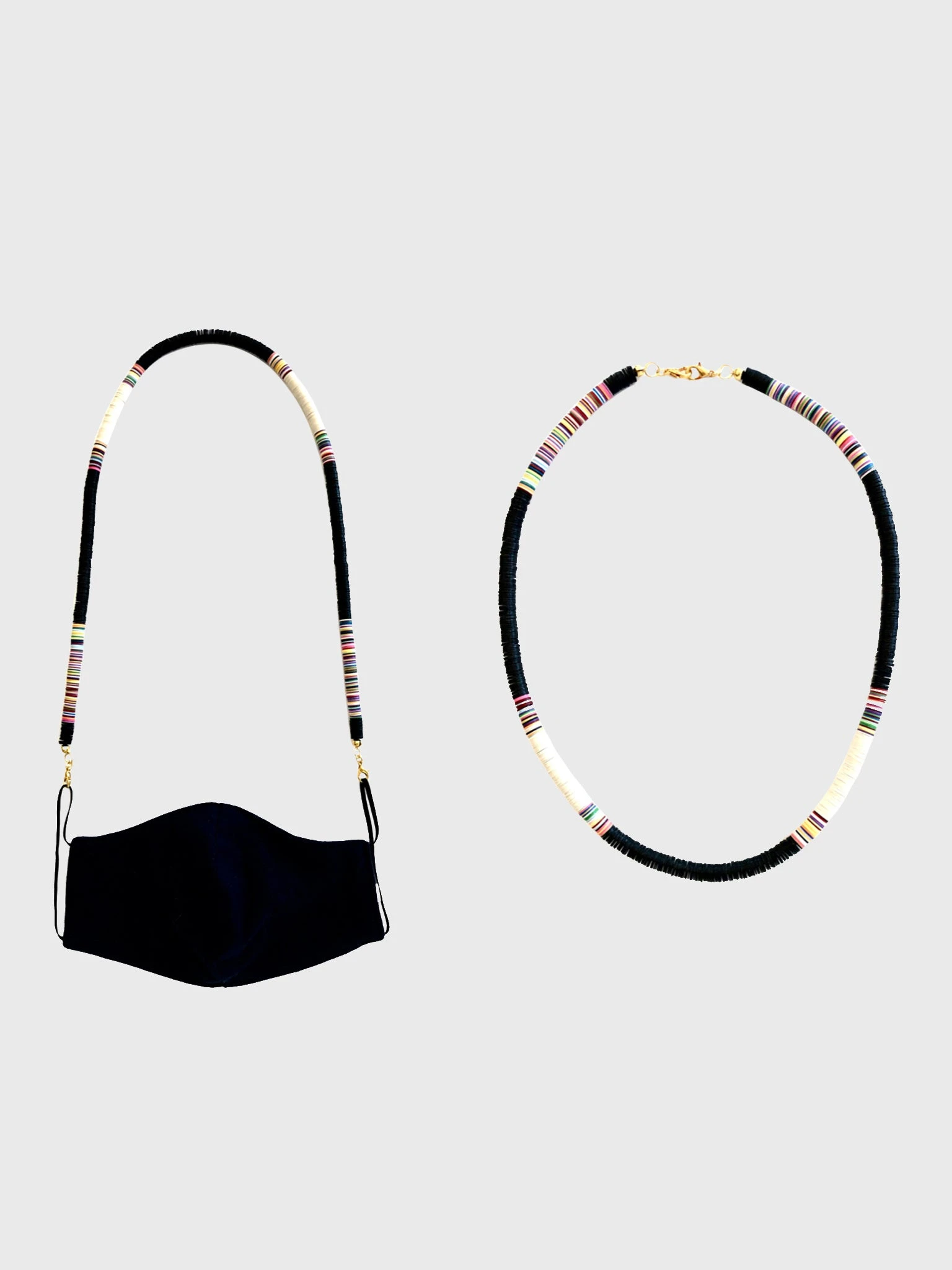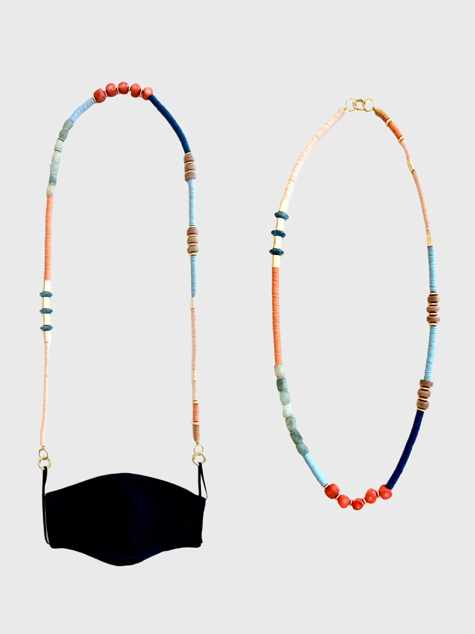 The Accessory Concierge Mask Strap and Necklace does it all! This piece will keep your mask handy, and doubles as a subtle mixed media statement necklace perfect for layering with a pop of color.