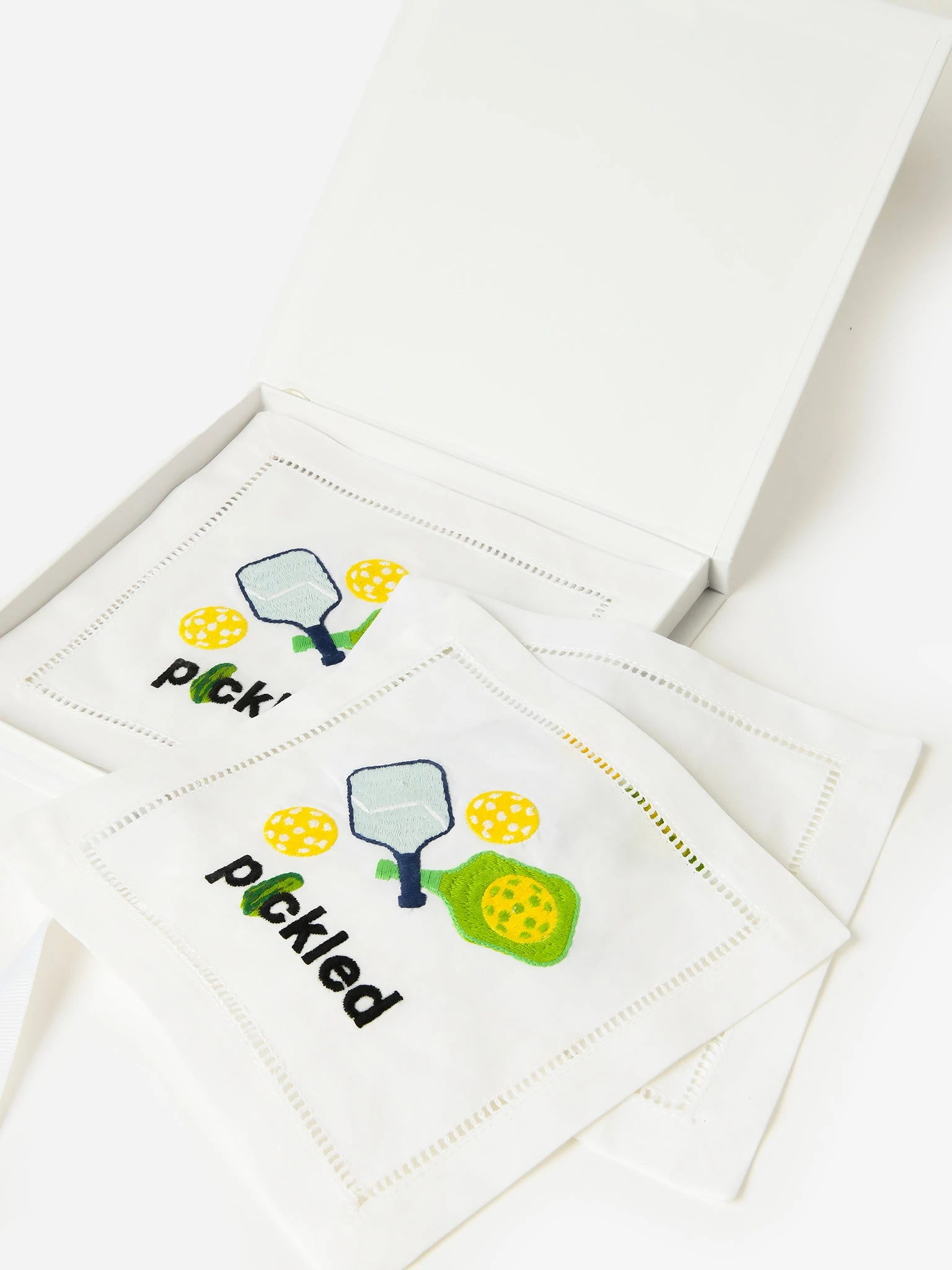 Set of four linen cocktail napkins with an embroidered pickleball motif.
