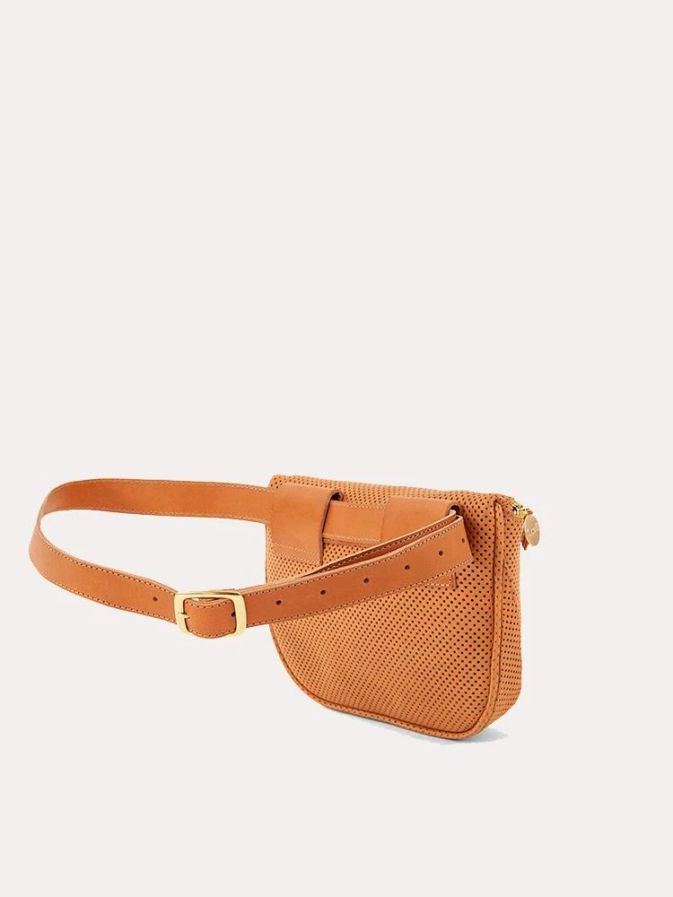 Clare V. s Cuoio Perf with Navy and Red Suede Desert Stripes Fanny Pack is a stylish hands-free way to carry all your essentials, ideal for travel or a striking accent to your favorite pair of jeans.