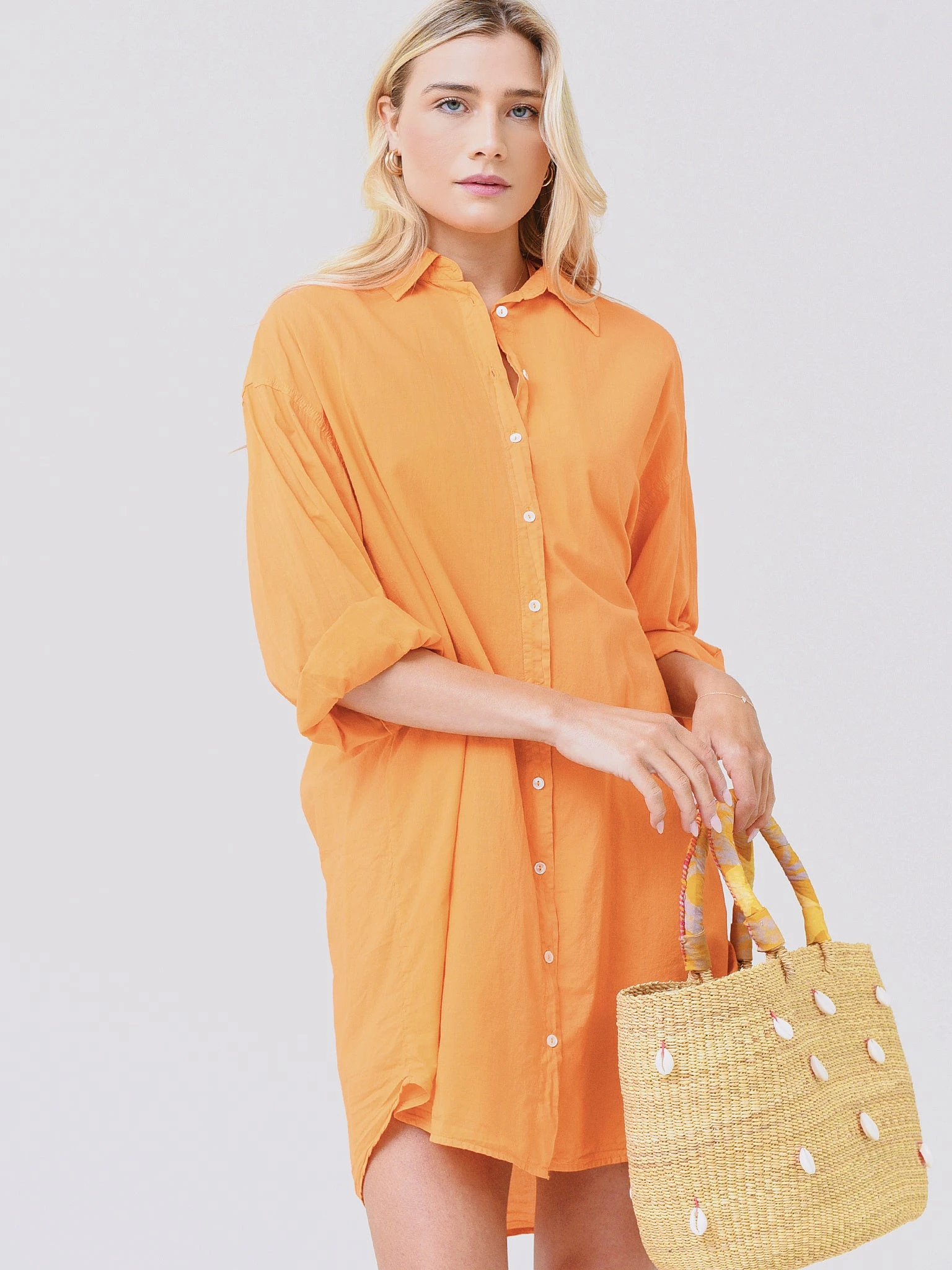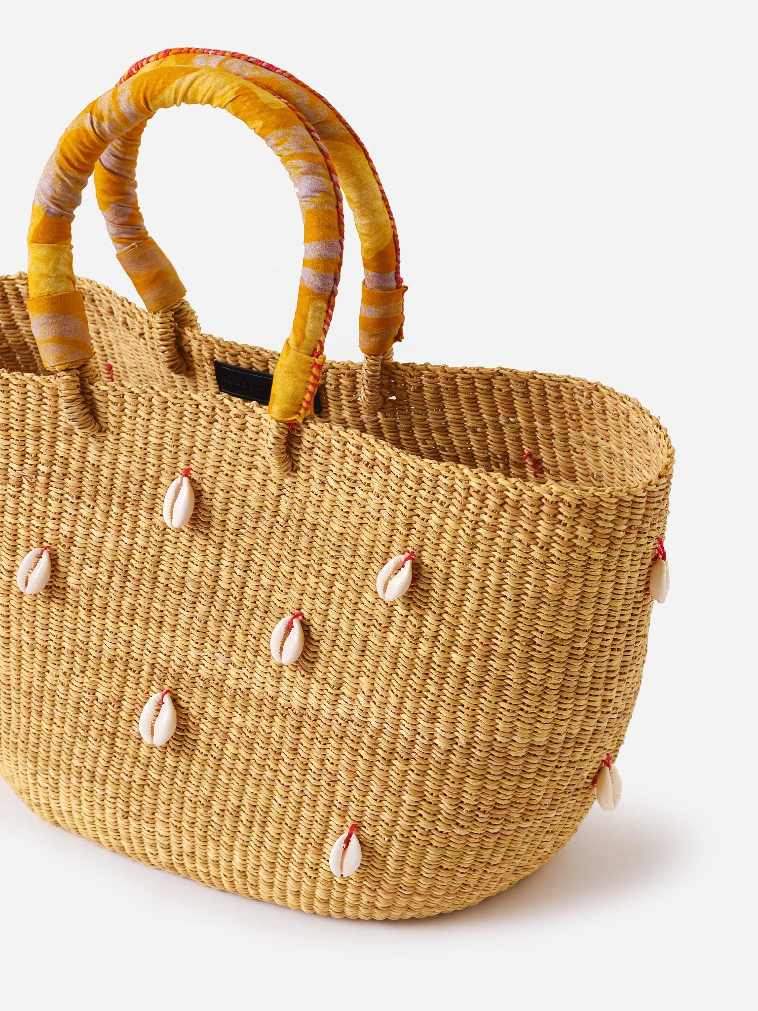 Handwoven tote made from sustainable elephant swamp grass and adorned with cowrie shells.