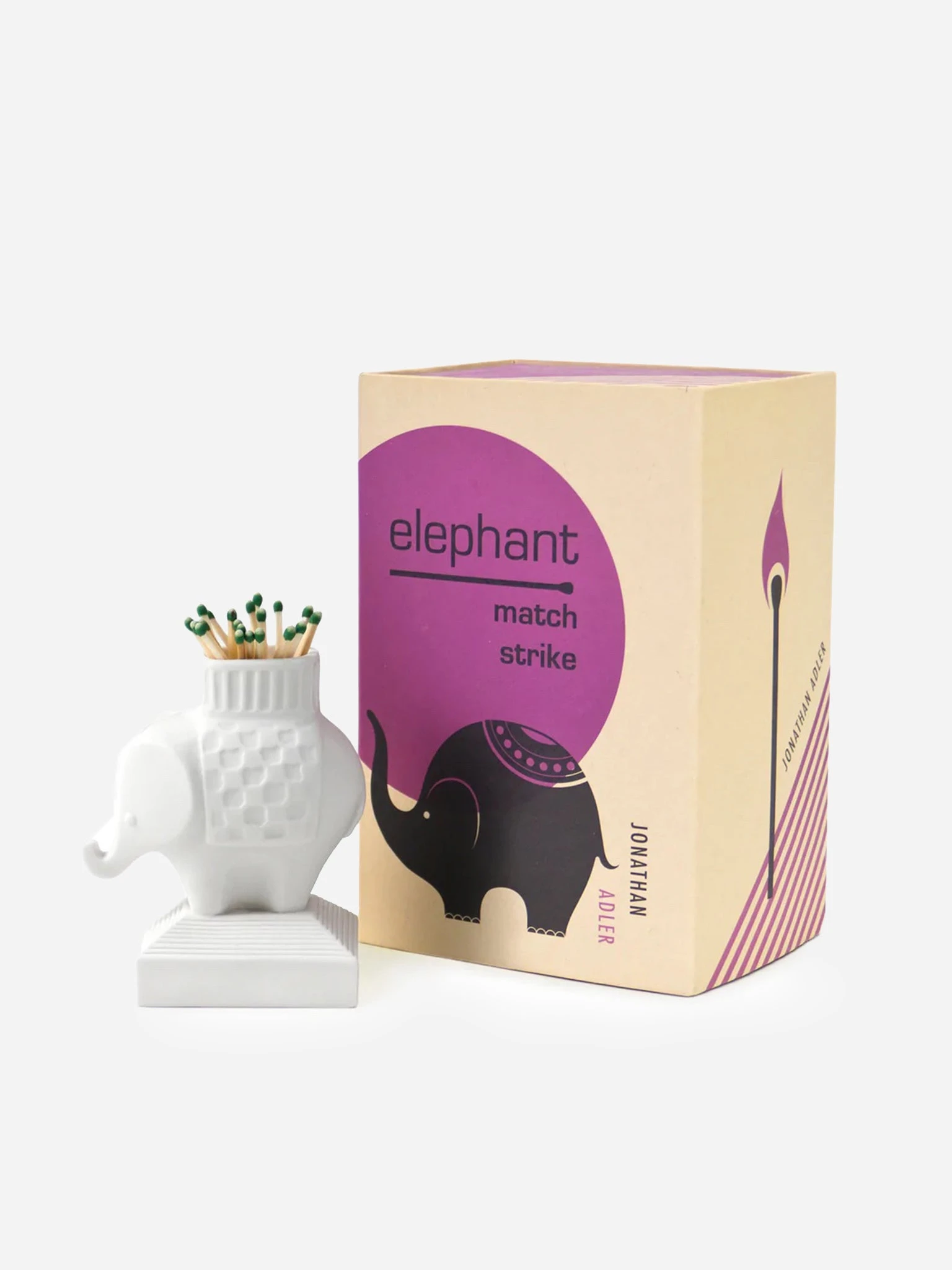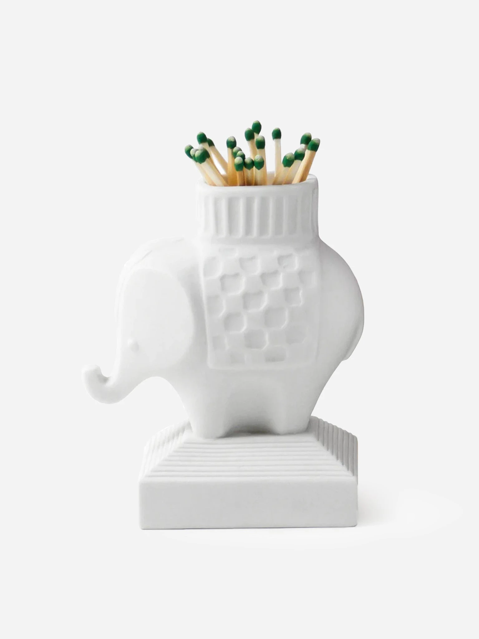 Elephant sculpture with a frictional base that ignites strike-anywhere matches.