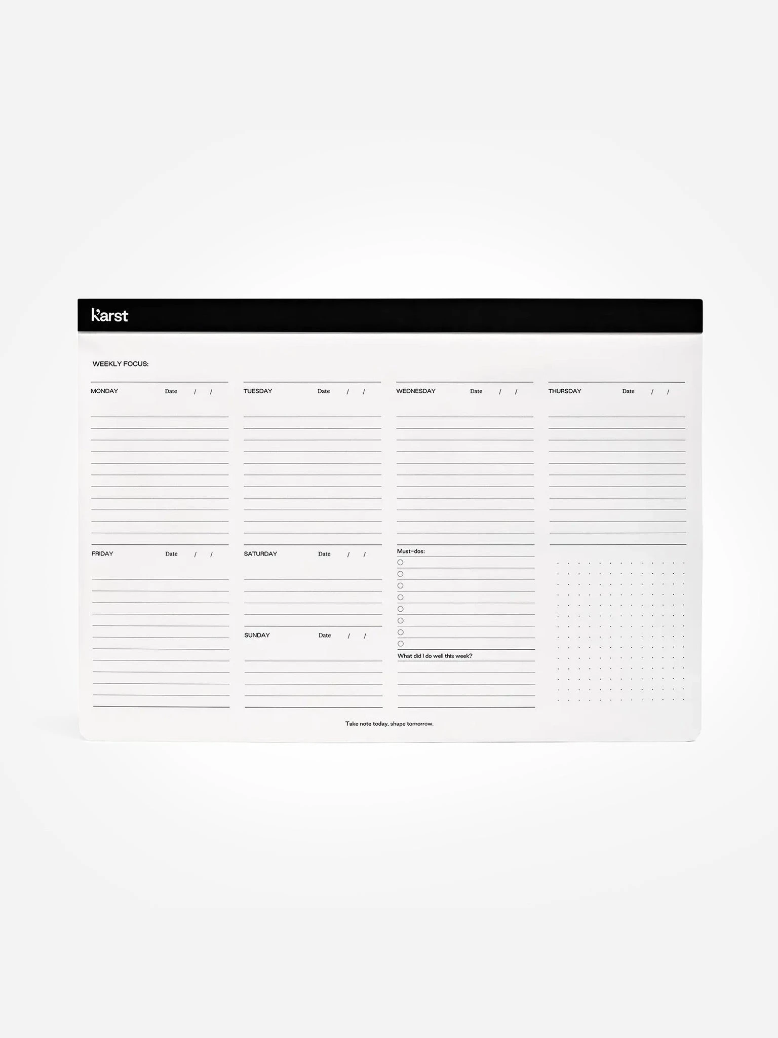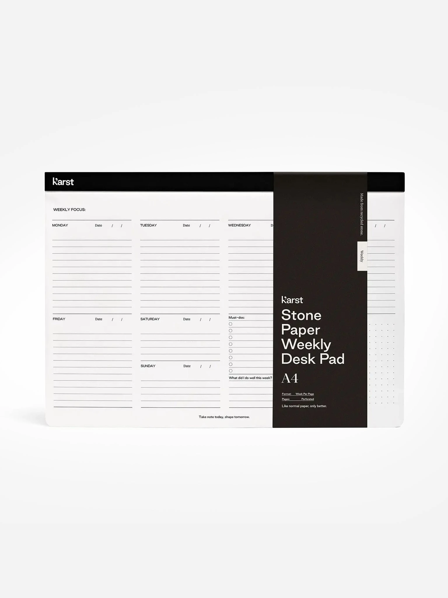 Weekly desk pad made from high-quality, sustainable, and recyclable stone paper.