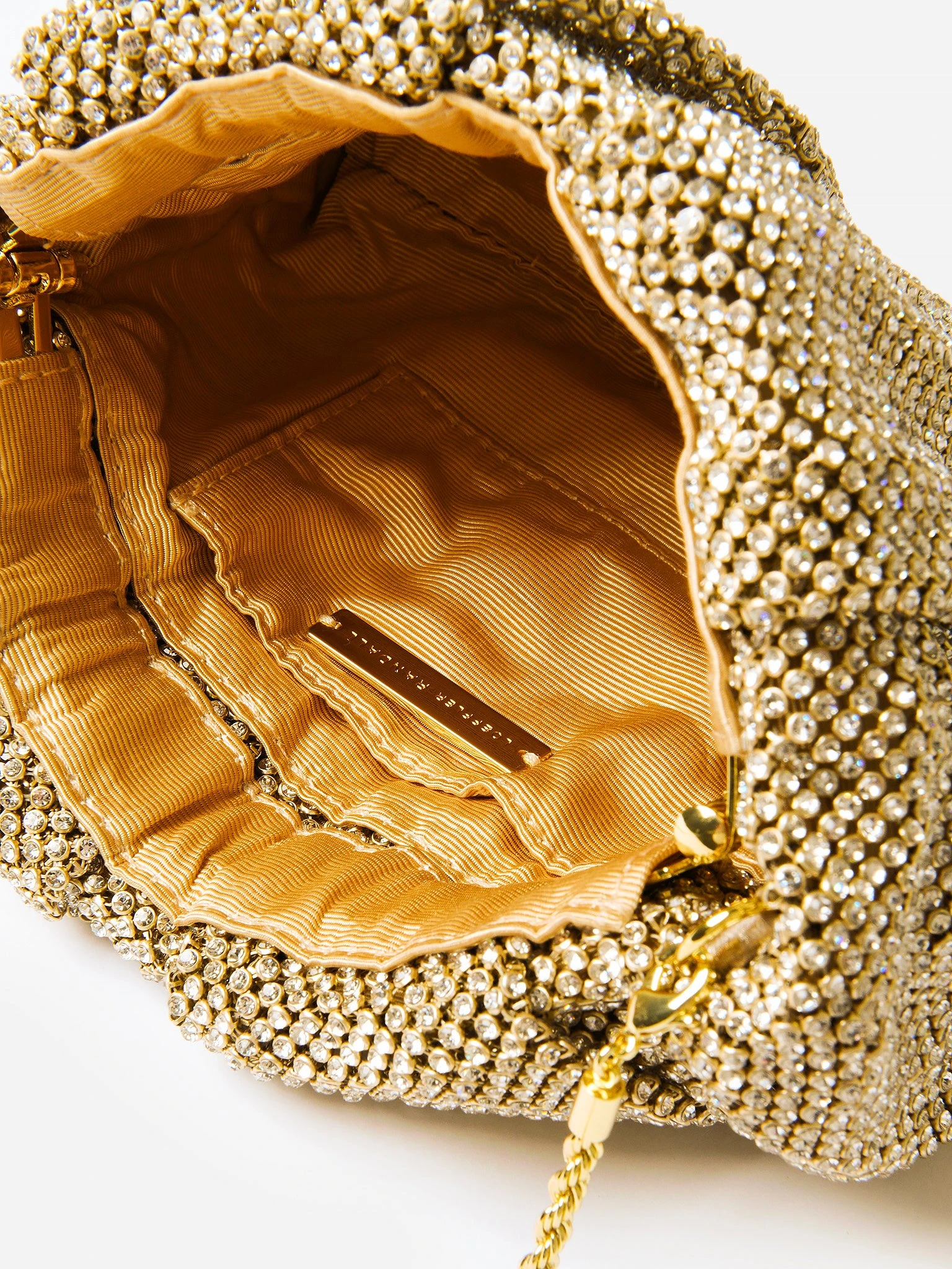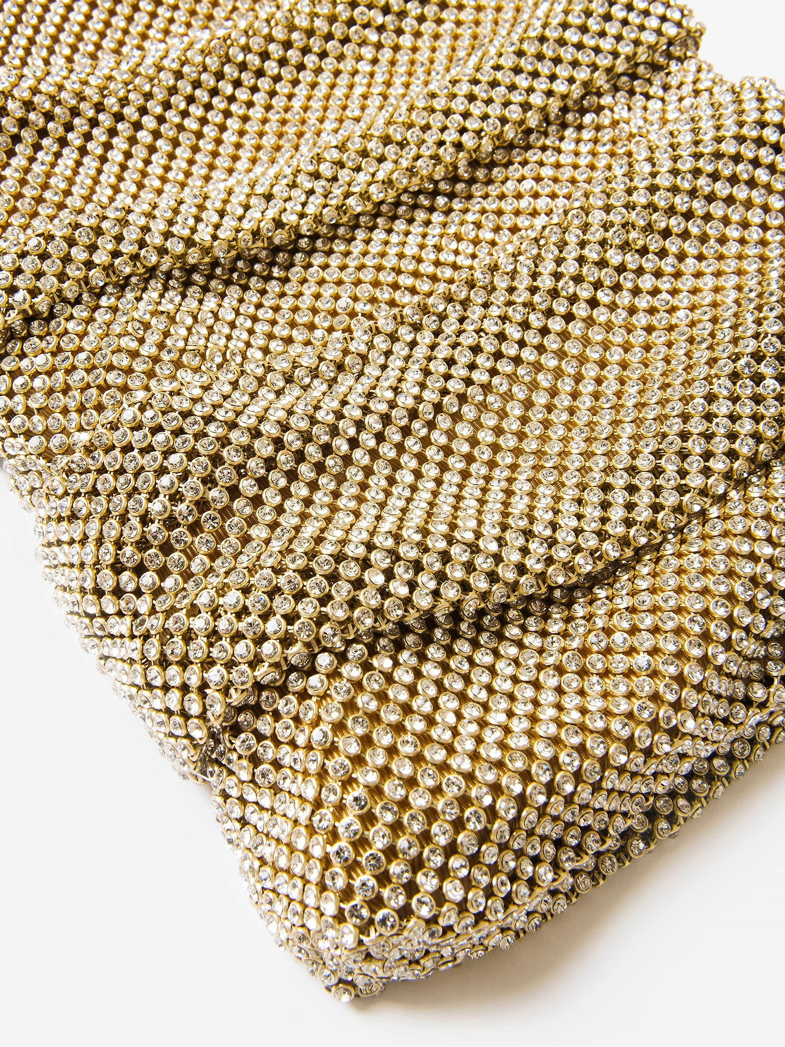 Gathered diamanté mesh clutch with a removable metal chain.