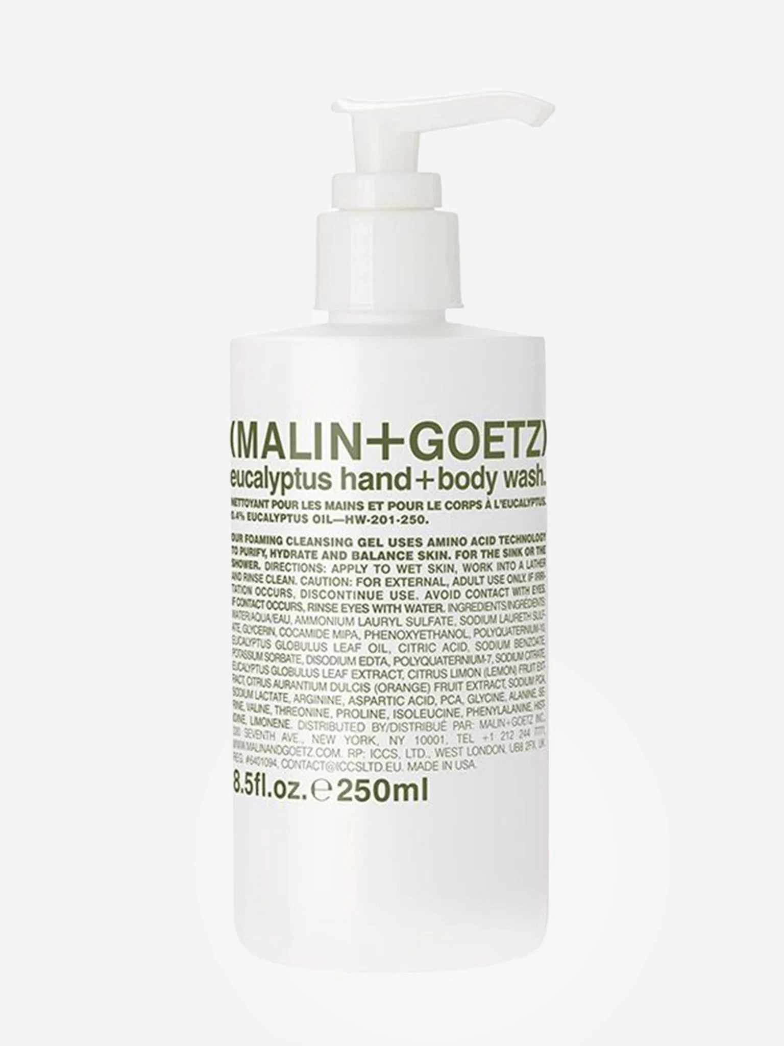 The Malin+Goetz Eucalyptus Hand + Body Wash Eucalyptus Hand + Body Wash lathers into a rich foam to effectively wash away dirt, sweat + debris. thoroughly purifies + refreshes without overdrying skin.