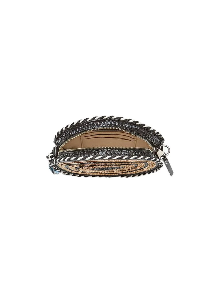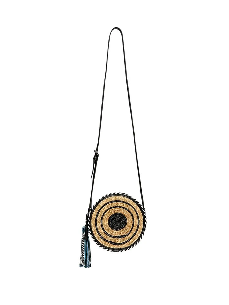 The Rebecca Minkoff Straw Circle Crossbody features both woven straw and leather material.