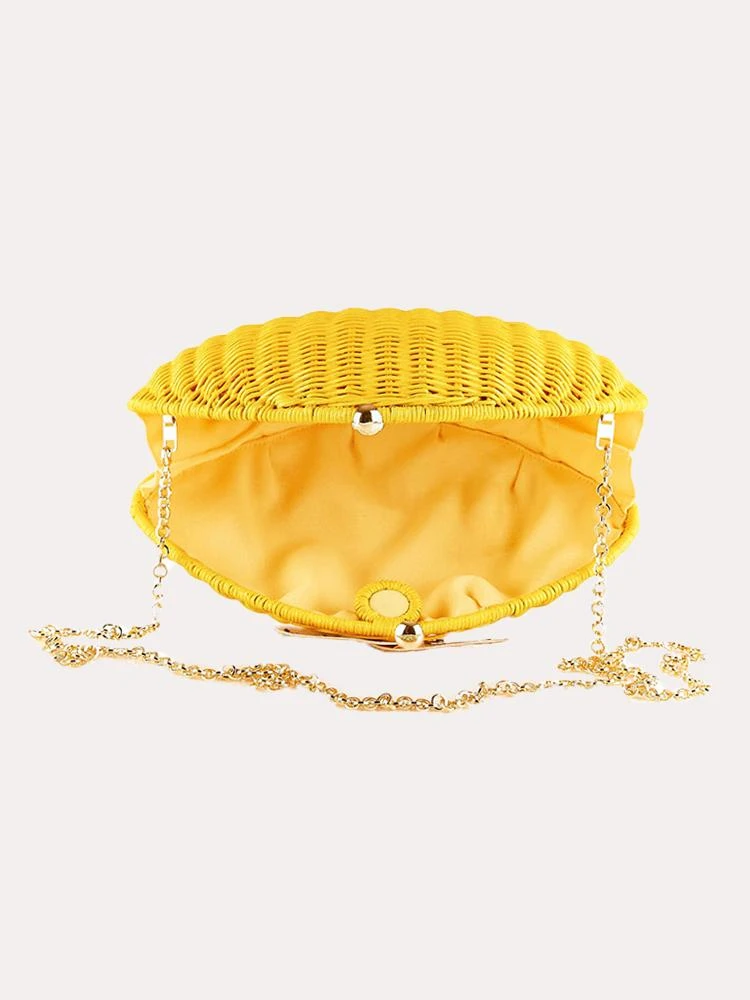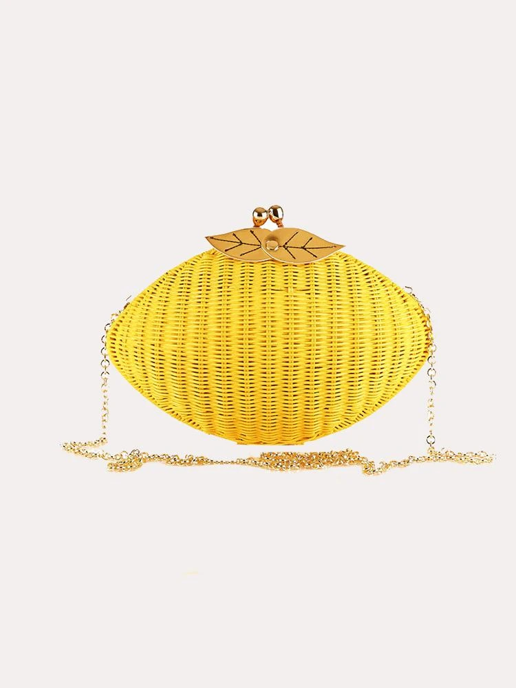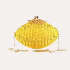 Clutch of braided wicker in Sicilian lemon format. Polyester lining and gold leaf detail at the top. Magnetic button closing. Comes with chain handle.