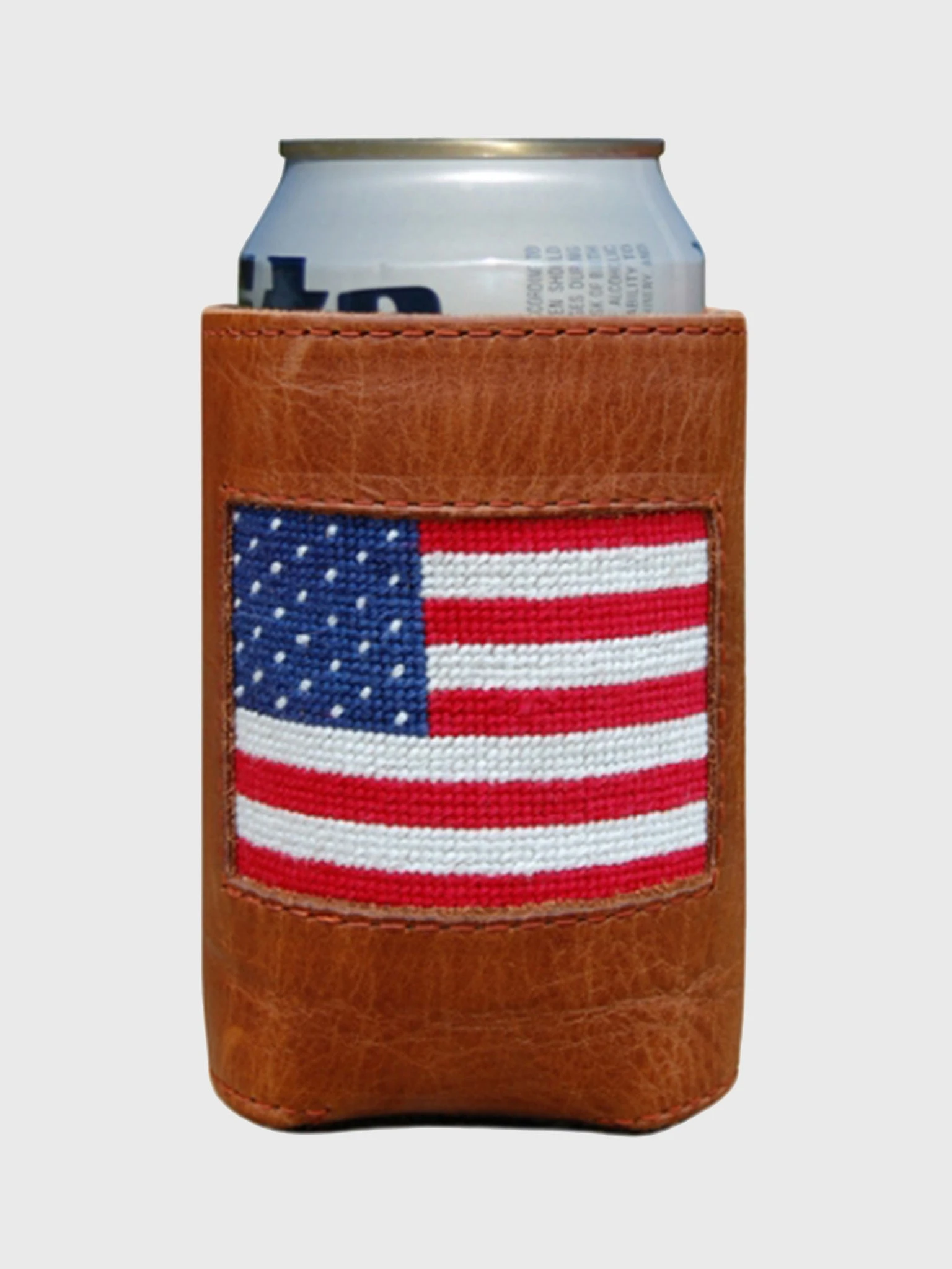 Can cooler with a neoprene liner and American flag needlepoint design.