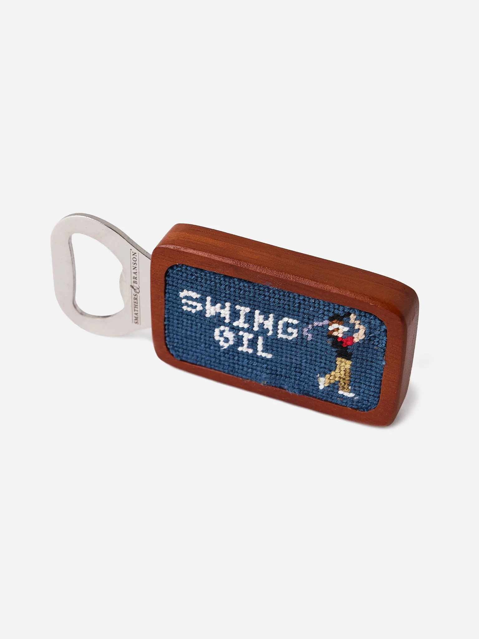 Improve your golfing performance with the Smathers & Branson Swing Oil Needlepoint Bottle Opener.