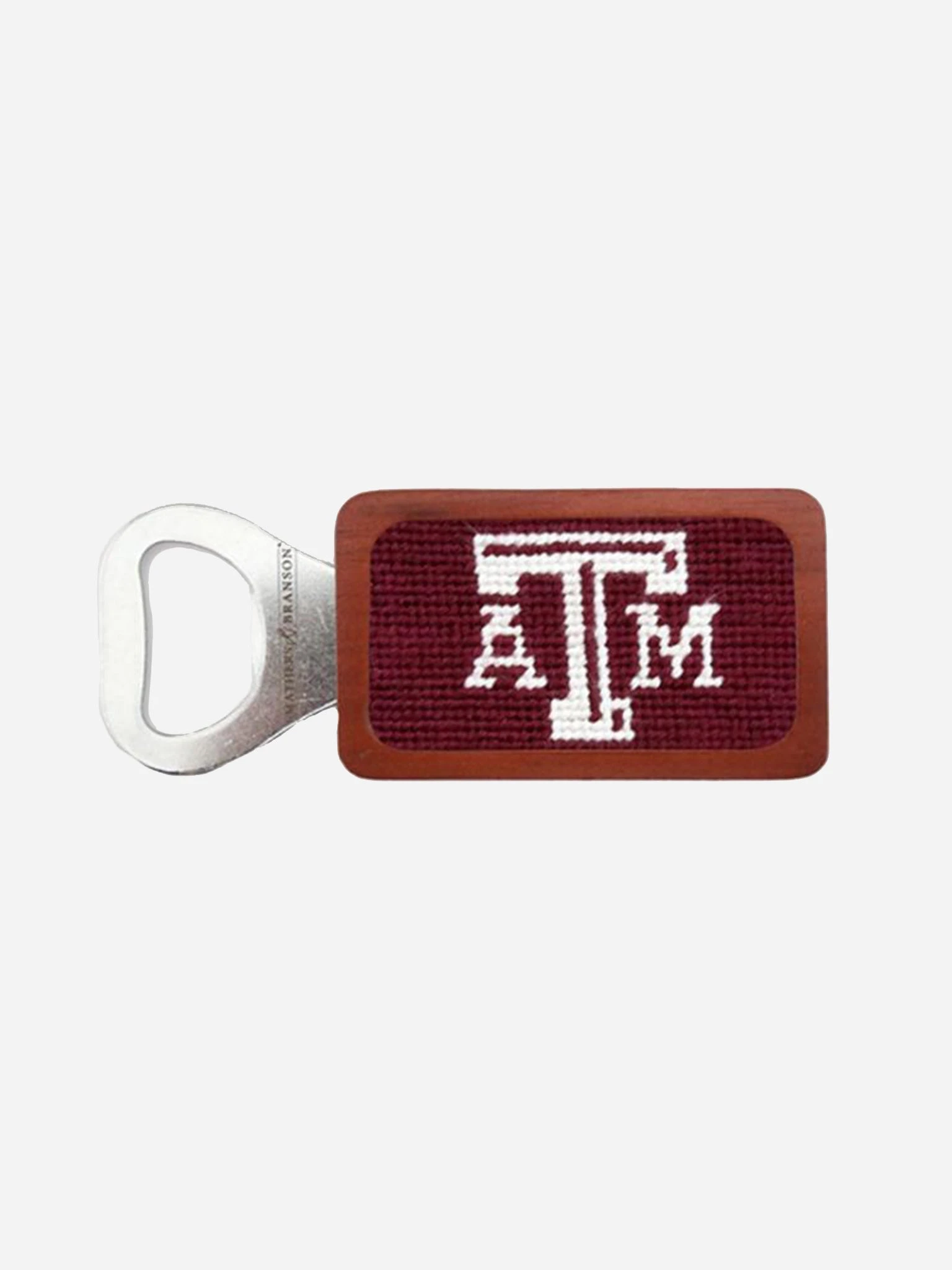 Wooden bottle opener with a Texas A&M University needlepoint design.