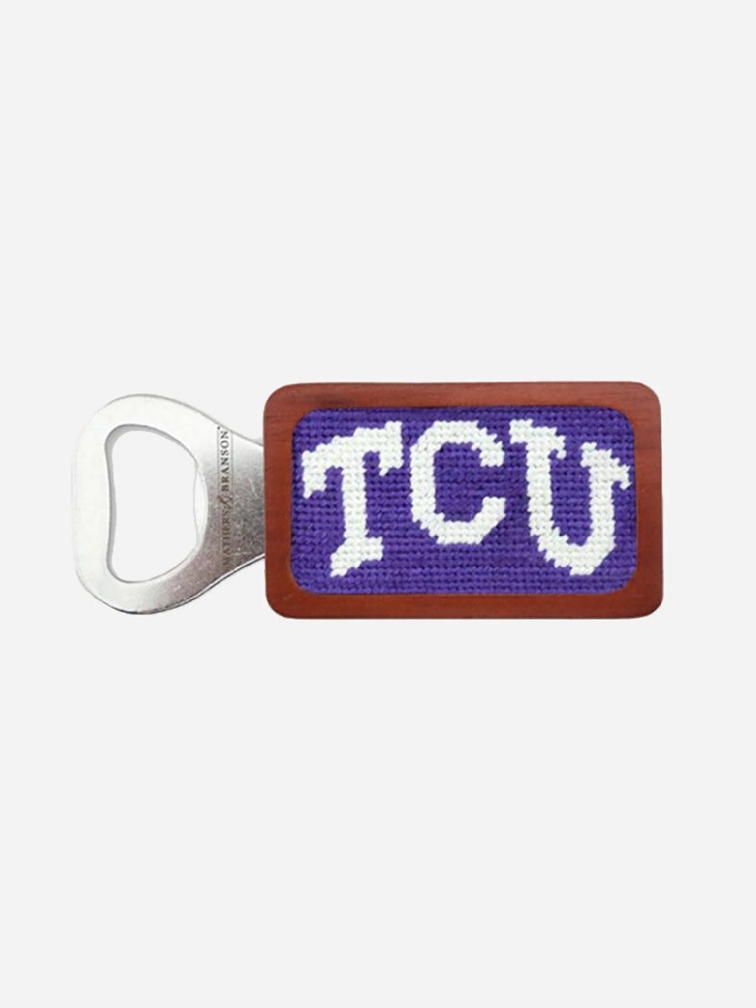 Magnetic bottle opener with a Texas Christian University design.