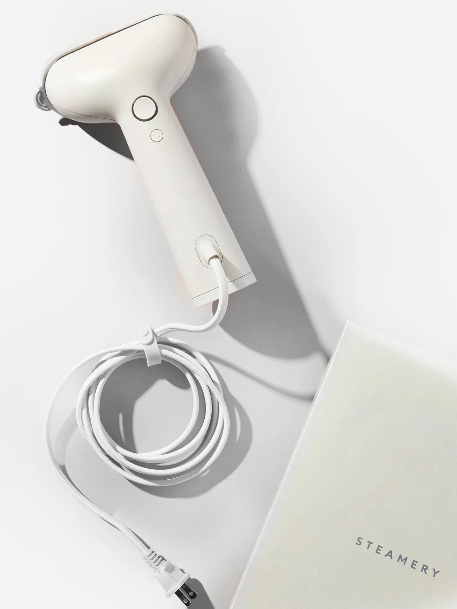 Two-in-one travel-friendly iron steamer with a hybrid design to create a pressed or natural look.