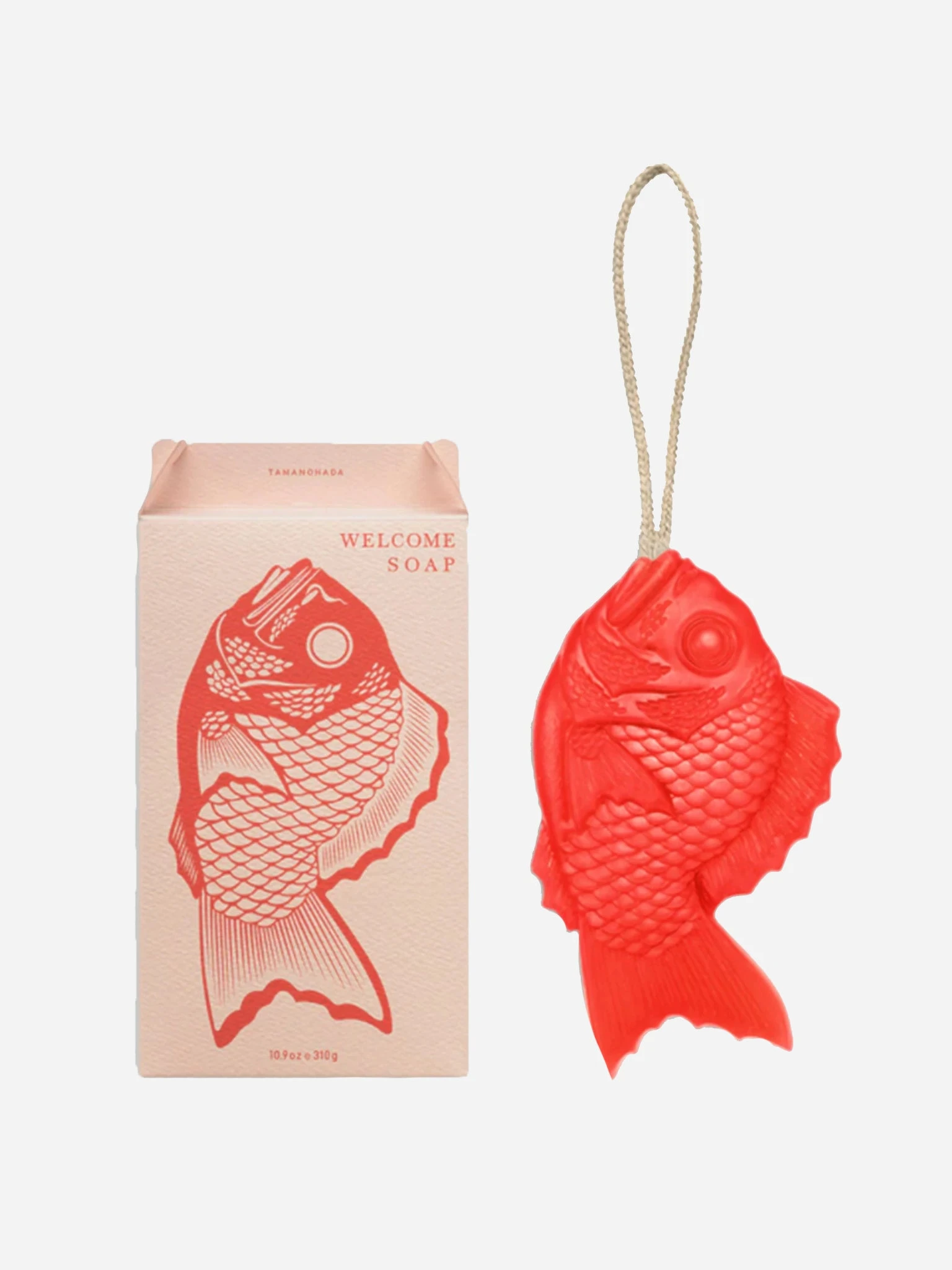 Decorative fish-shaped soap with a naturally moisturizing palm oil formula.